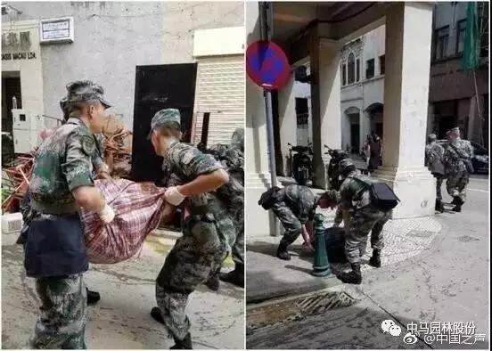 經(jīng)澳門(mén)特區(qū)政府申請(qǐng)、中央政府批準(zhǔn),根據(jù)中央軍委命令,從8月25日起,駐澳門(mén)部隊(duì)協(xié)助澳門(mén)特區(qū)政府及市民一起參加災(zāi)后重建和恢復(fù)秩序工作。25日上午10時(shí)許,約1000名駐澳門(mén)部隊(duì)官兵趕到受災(zāi)地迅速展開(kāi)援助工作,并與現(xiàn)場(chǎng)的澳門(mén)保安部隊(duì)人員、義工及居民攜手,清理街道垃圾和障礙物。